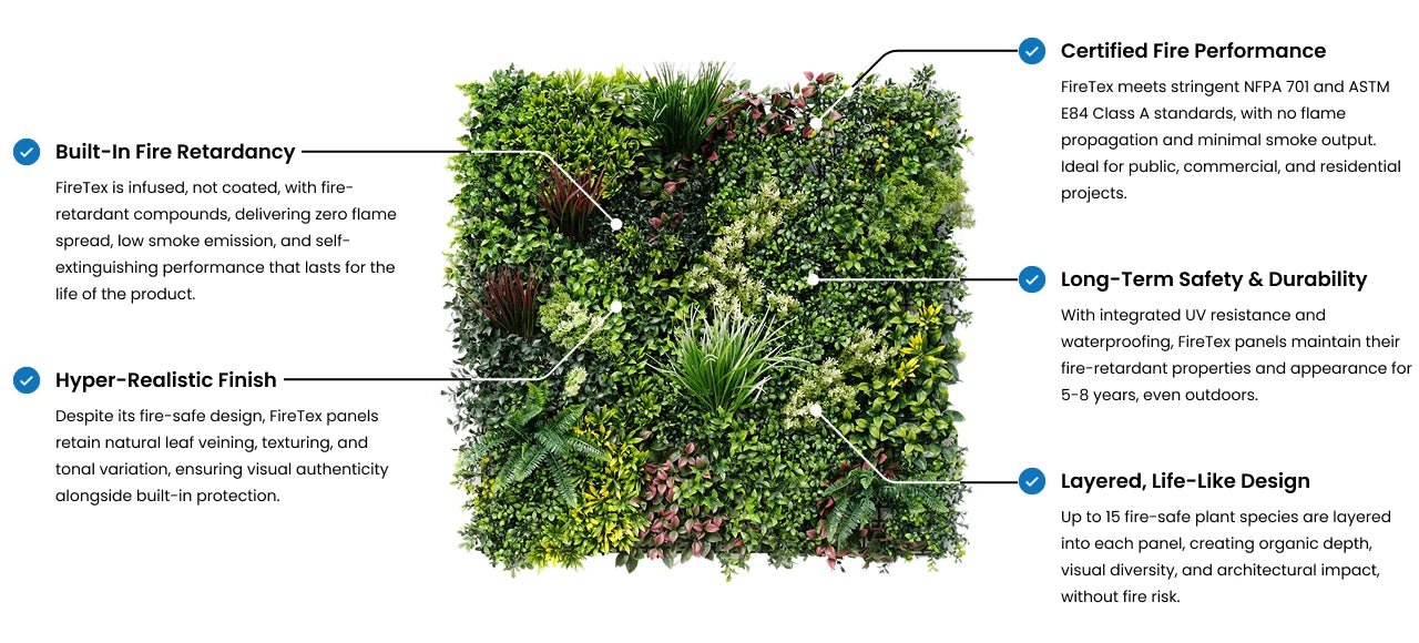 Our FireTex® technology combines lifelike design with world-class fire retardancy, engineered for spaces that demand safety without compromising realism. You are responsible for your project, and Designer Vertical Gardens does not guarantee or warrant product suitability for specific projects.